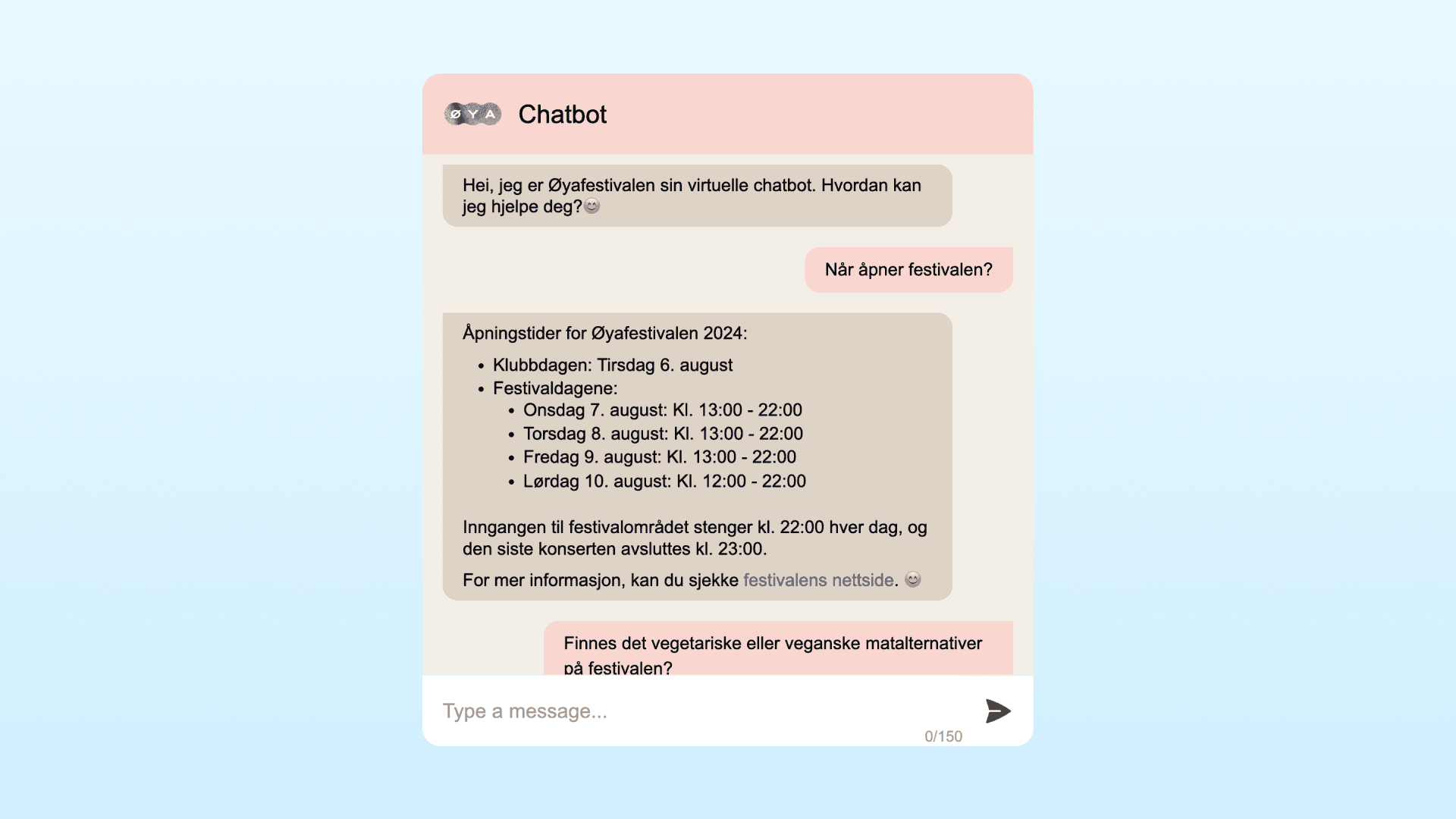 Enten du er en erfaren festivalgjenger eller skal oppleve Øyafestivalen for første gang, kan chatboten hjelpe deg med alt du trenger å vite om festivalen, artister, billettbytte, aktiviteter og mye mer.