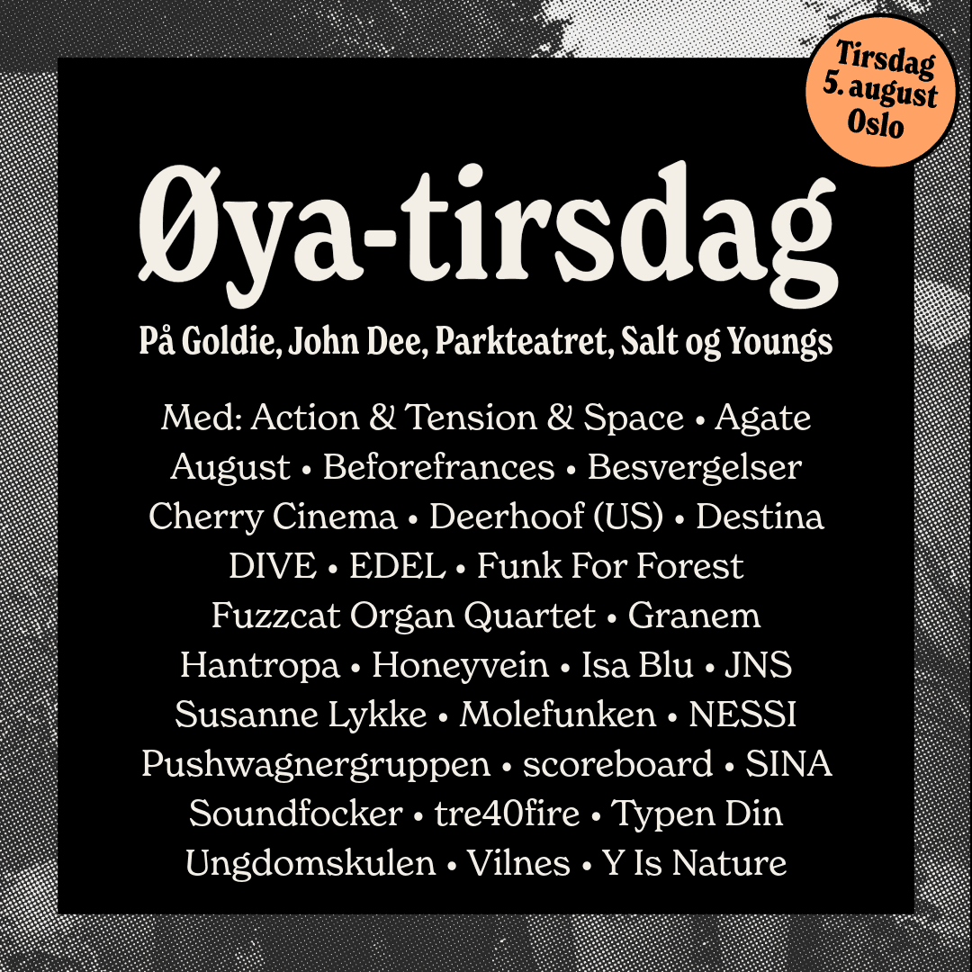 Tirsdag 5. august er det oppvarming til Øyafestivalen 2025, med masse ny musikk på noen av våre favorittscener. Har du byttet ukespasset ditt i armbånd på forhånd, vil dette gi deg mulighet til gratis inngang på Øya-tirsdag, så lenge kapasiteten tillater det. Klubbene vil i tillegg selge billetter til de som ikke har ukespass på armen.